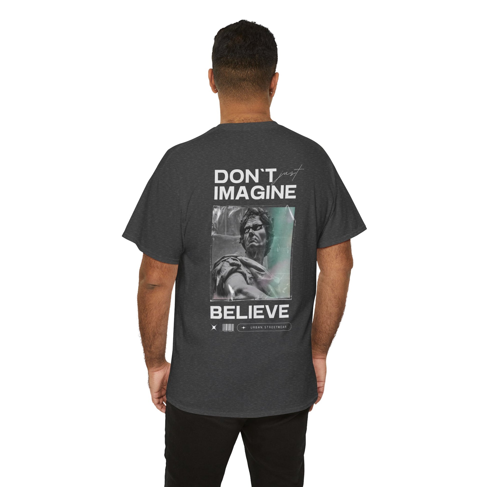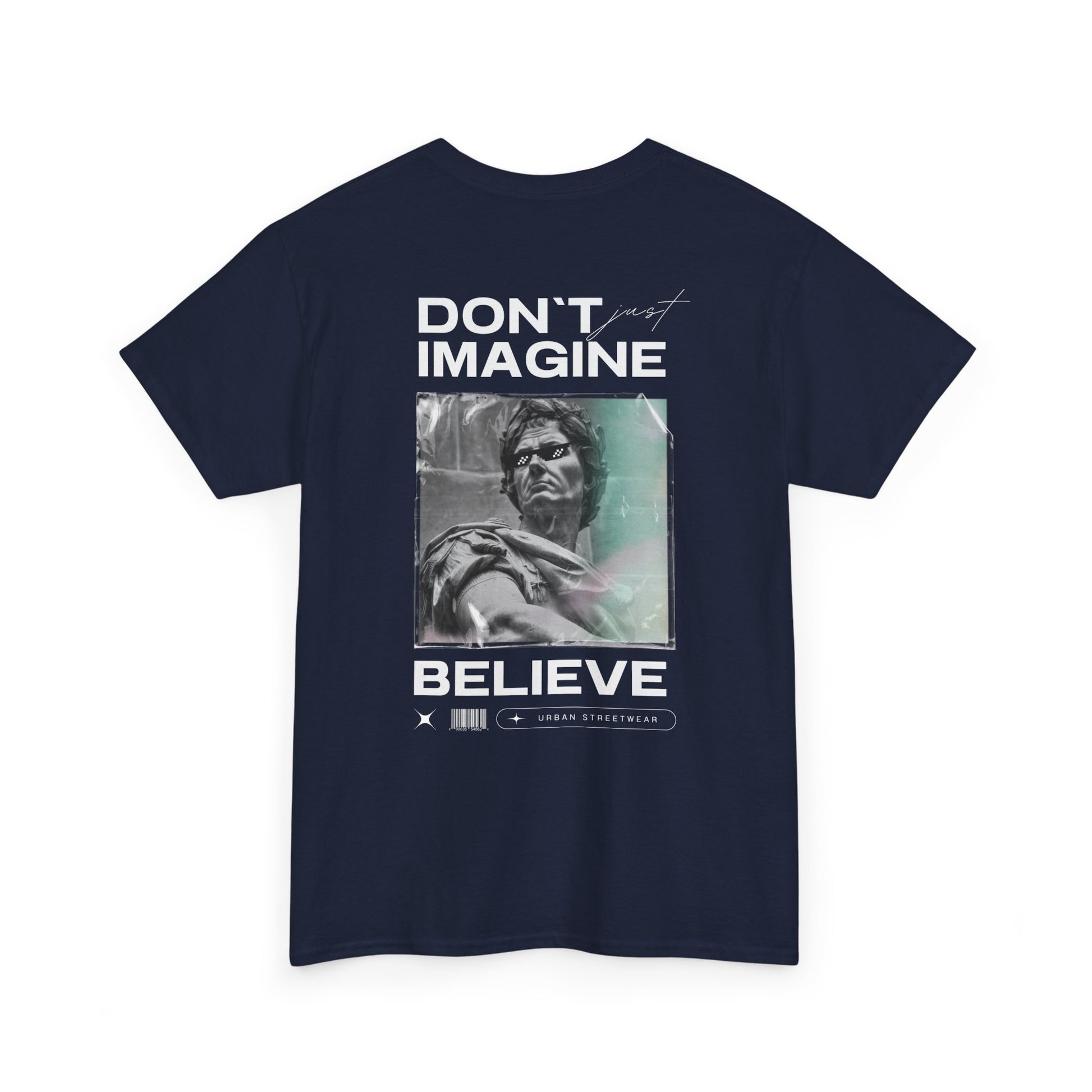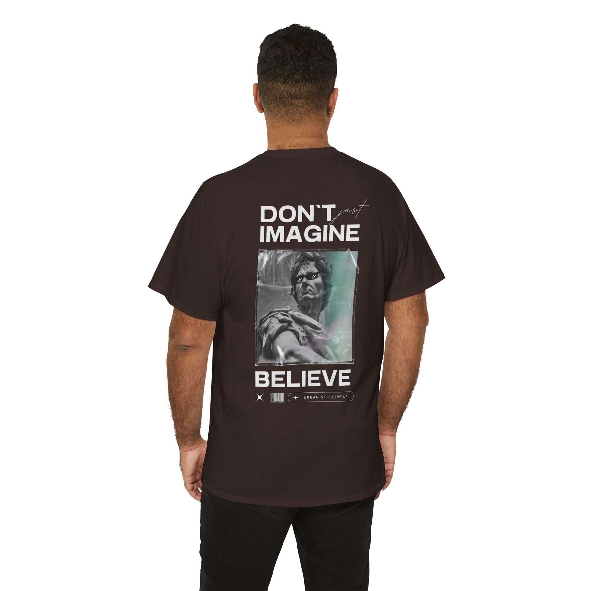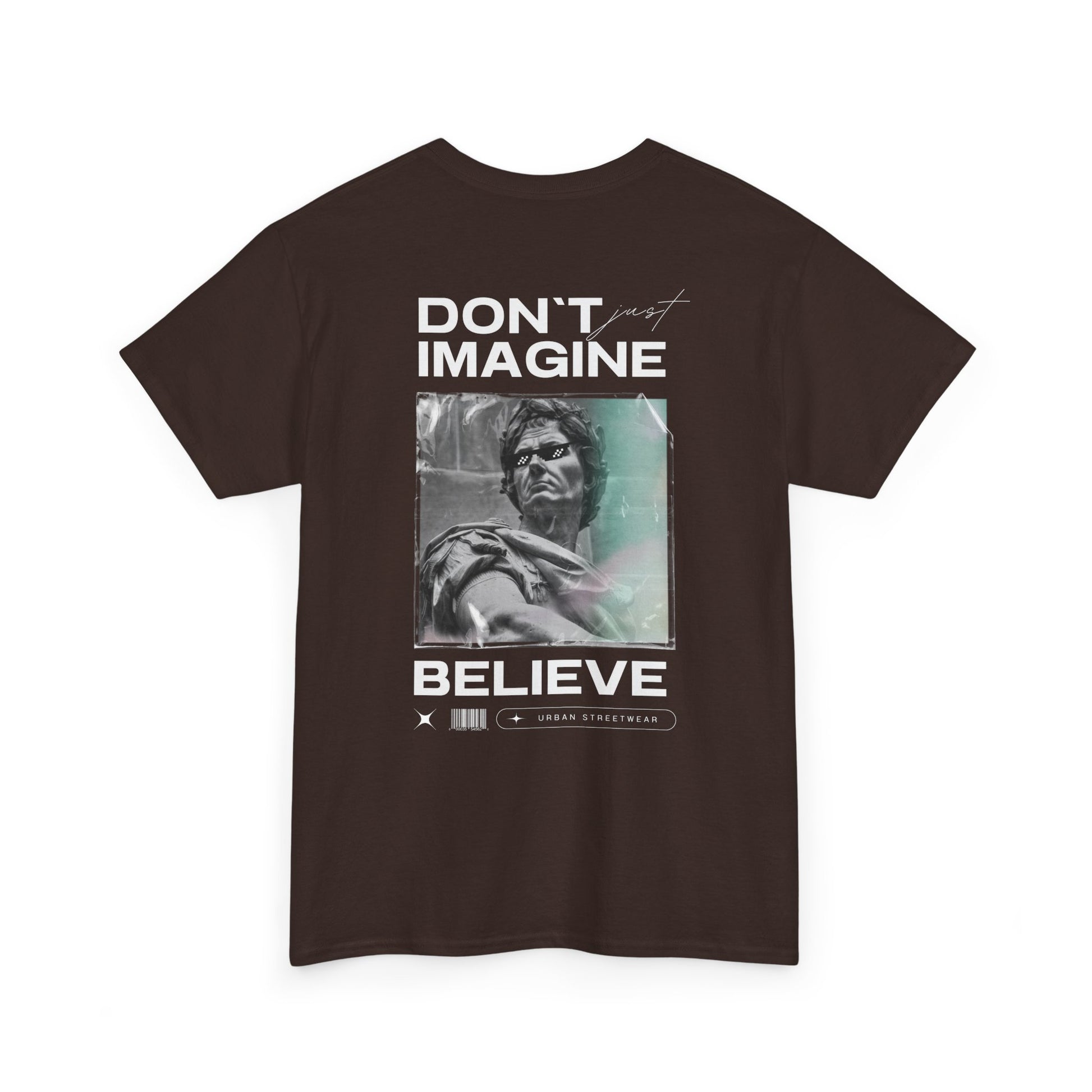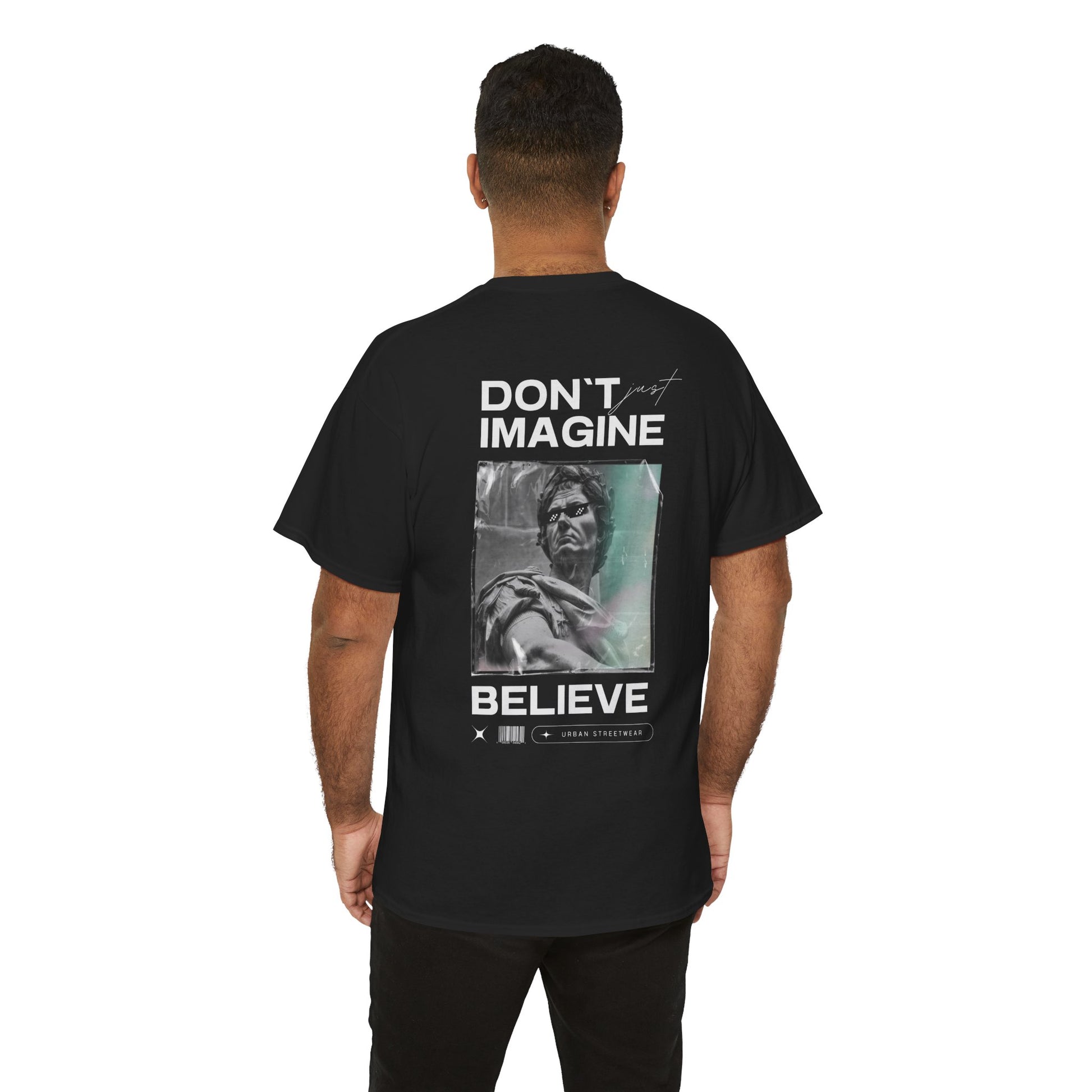 Esta camiseta clásica de cuello redondo lleva un llamativo estampado cinematográfico en la espalda que dice «DON'T JUST IMAGINE — BELIEVE» (No solo imagines, cree), superpuesto sobre un retrato monocromo y detalles en verde azulado apagado. La camiseta transmite sencillez y naturalidad: el algodón suave y liso y el corte holgado la convierten en una prenda cómoda como una vieja favorita, mientras que el estampado le da un toque discreto y seguro. Póntela cuando quieras que tu look transmita determinación: paseando por las calles de la ciudad al atardecer, hojeando una revista en una cafetería o debajo de una chaqueta para ir a un concierto. Está pensada para personas que prefieren la esencia al brillo, que coleccionan imágenes significativas y referencias sutiles, y que aprecian la comodidad fiable que sigue siendo una declaración de intenciones.