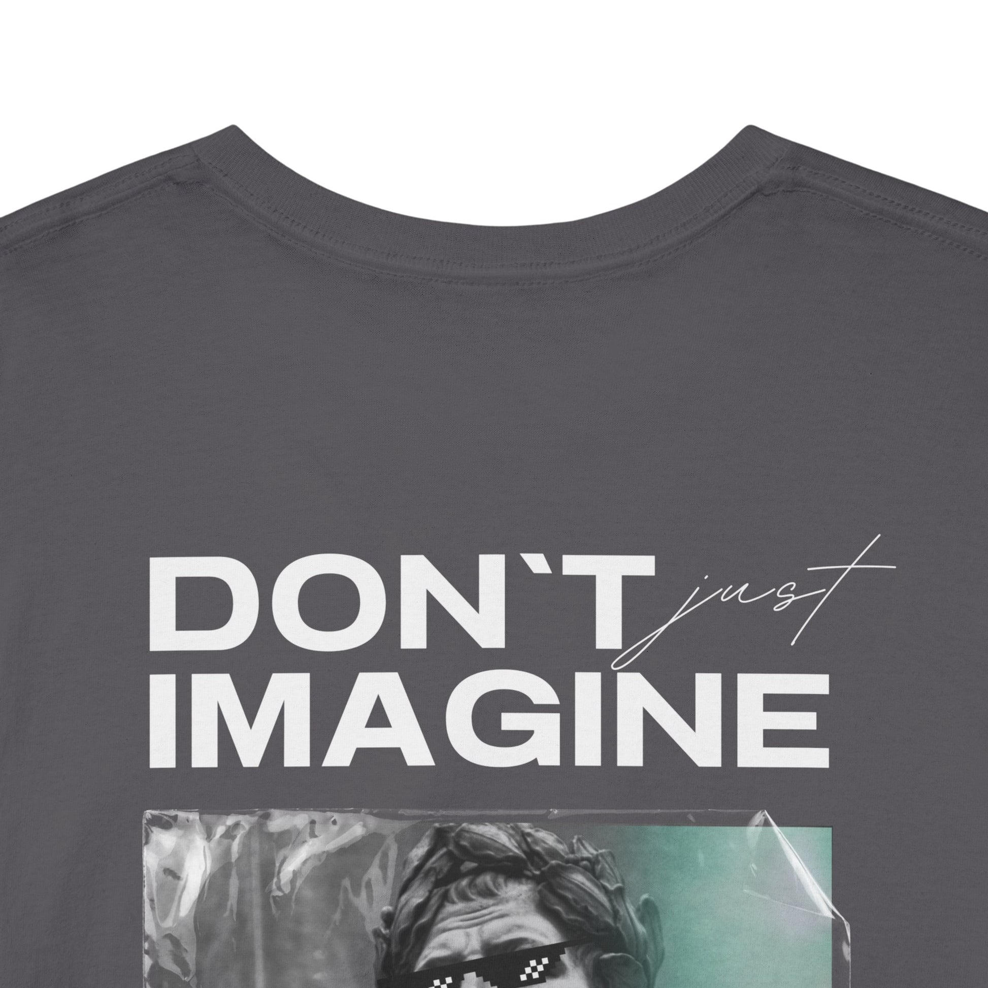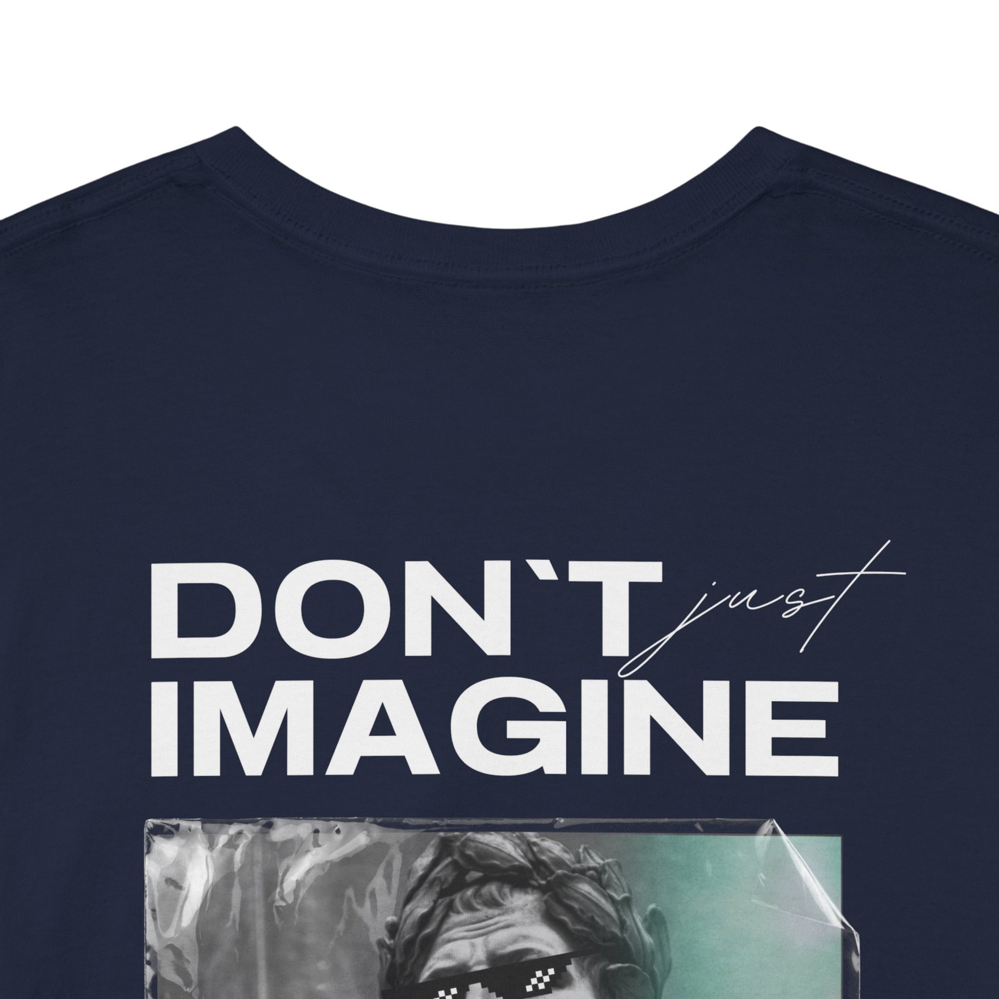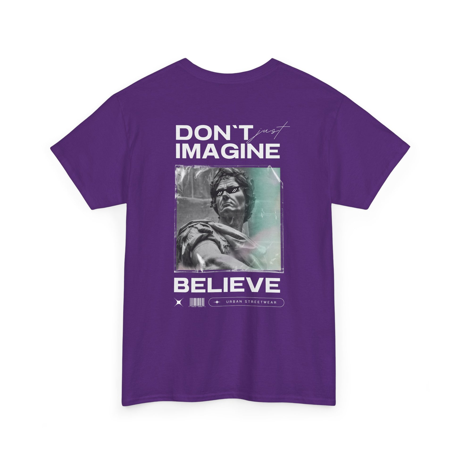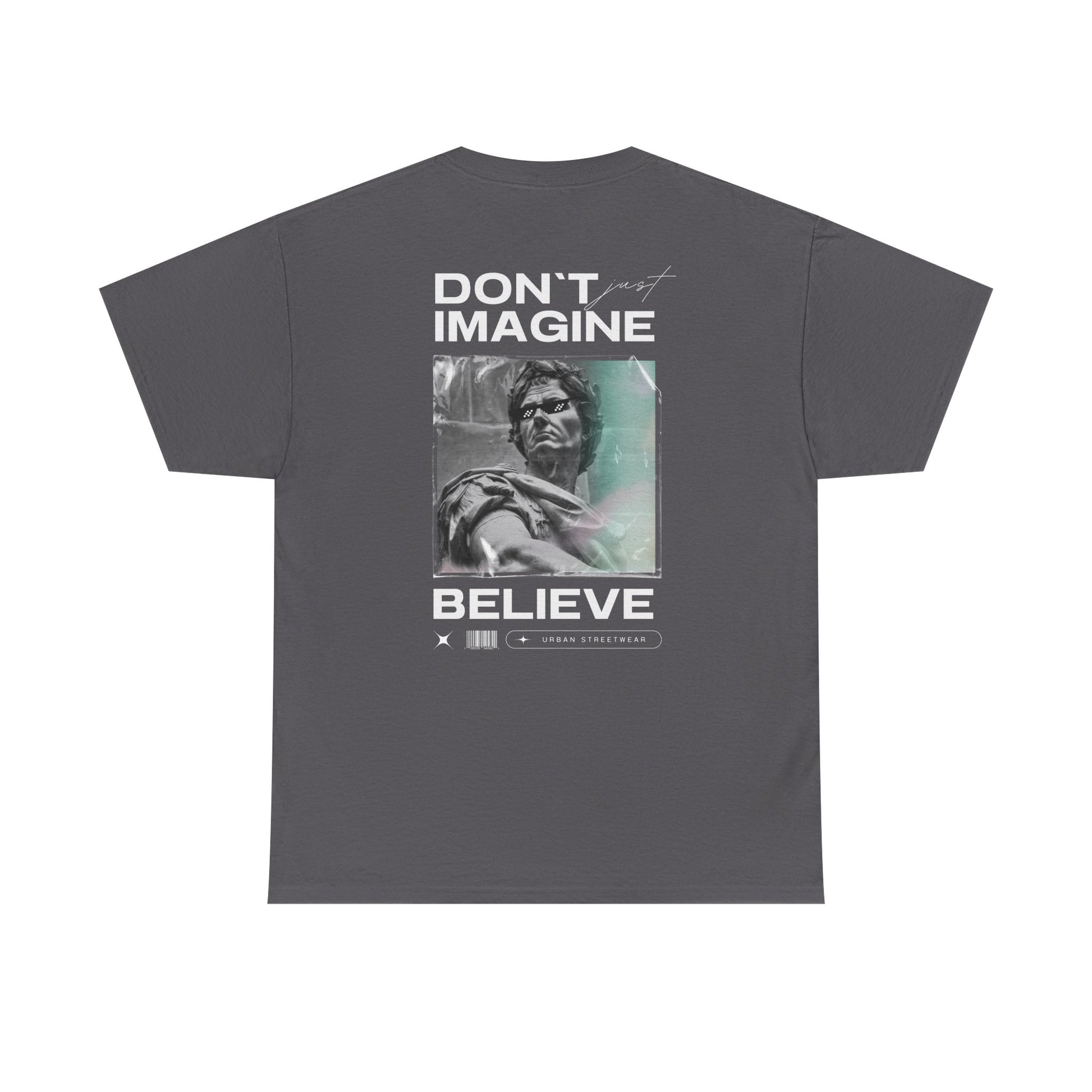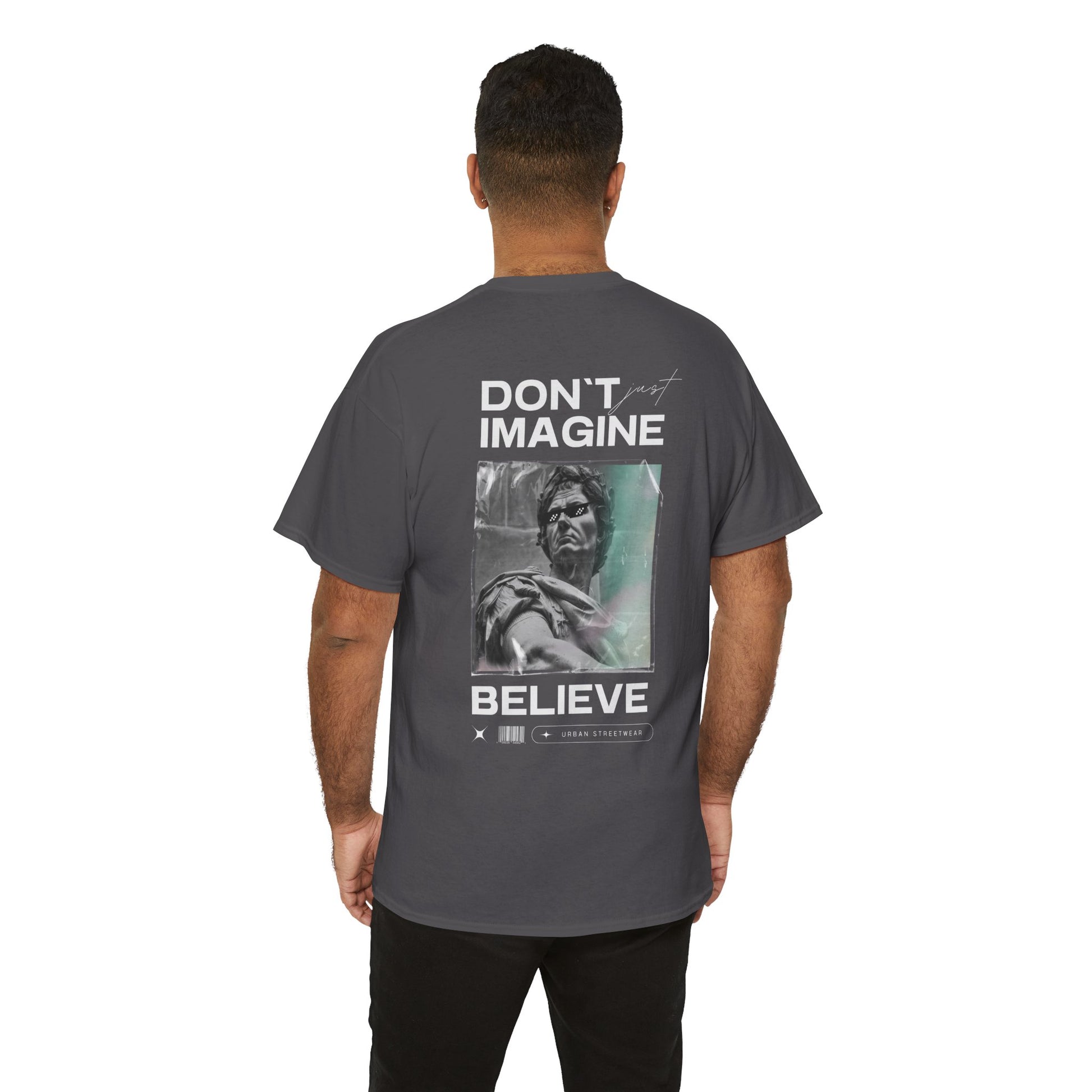 Esta camiseta clásica de cuello redondo lleva un llamativo estampado cinematográfico en la espalda que dice «DON'T JUST IMAGINE — BELIEVE» (No solo imagines, cree), superpuesto sobre un retrato monocromo y detalles en verde azulado apagado. La camiseta transmite sencillez y naturalidad: el algodón suave y liso y el corte holgado la convierten en una prenda cómoda como una vieja favorita, mientras que el estampado le da un toque discreto y seguro. Póntela cuando quieras que tu look transmita determinación: paseando por las calles de la ciudad al atardecer, hojeando una revista en una cafetería o debajo de una chaqueta para ir a un concierto. Está pensada para personas que prefieren la esencia al brillo, que coleccionan imágenes significativas y referencias sutiles, y que aprecian la comodidad fiable que sigue siendo una declaración de intenciones.