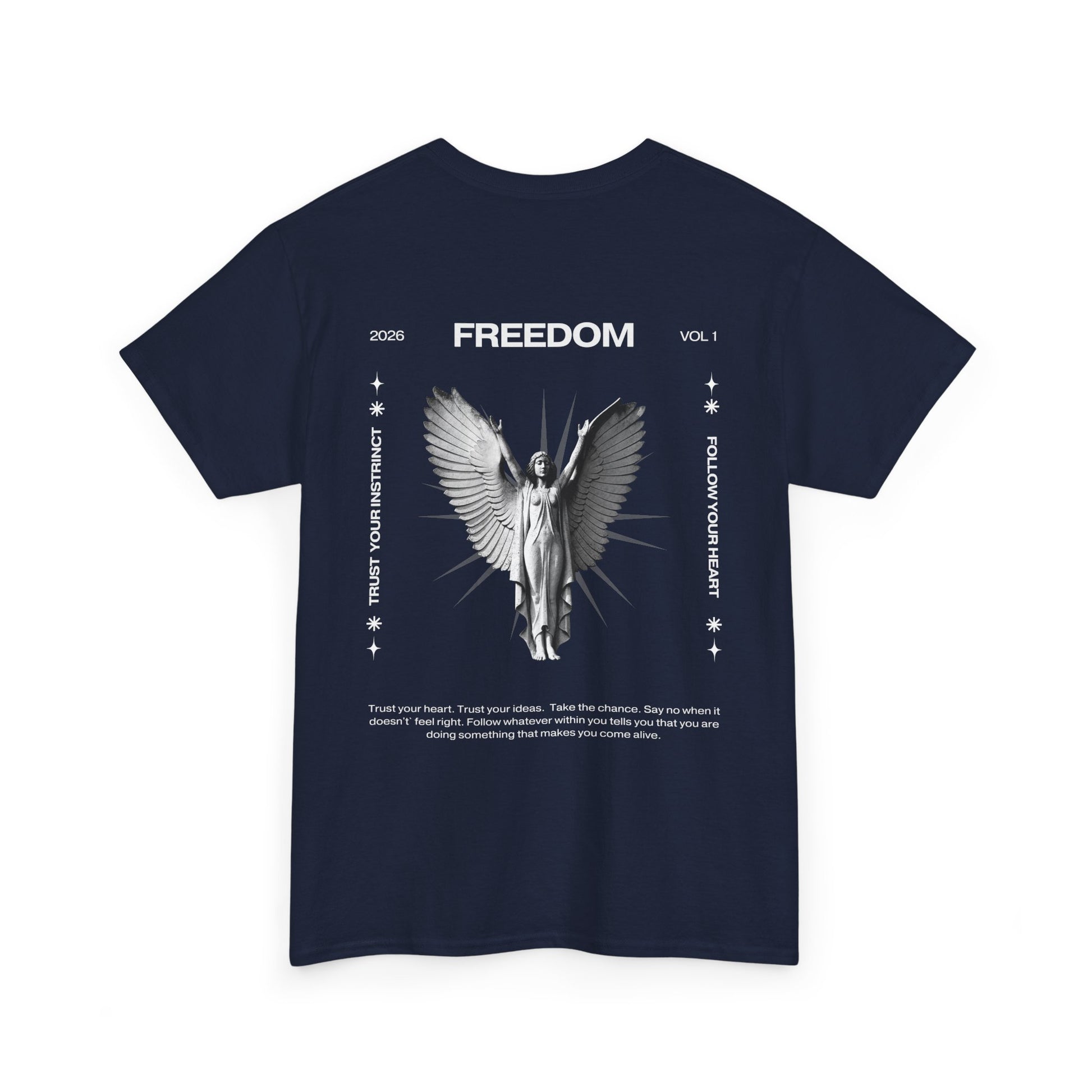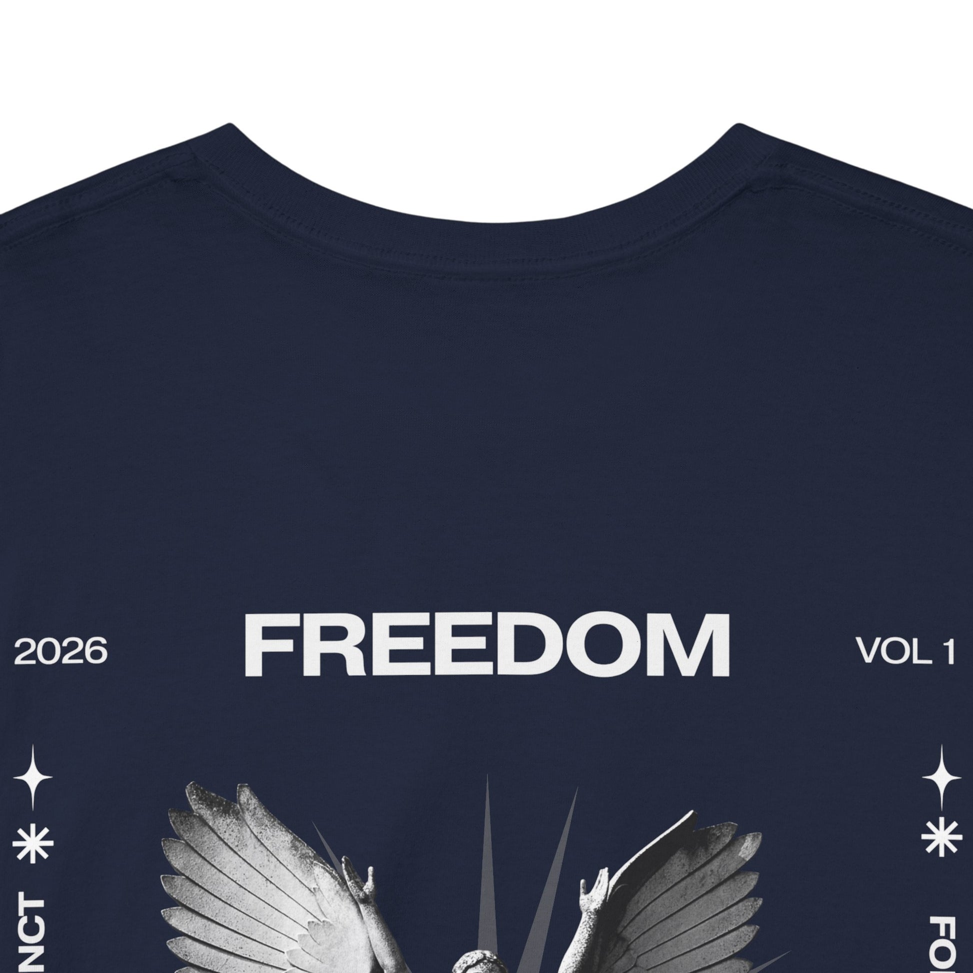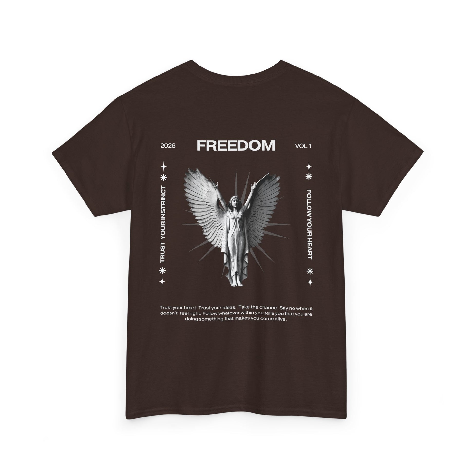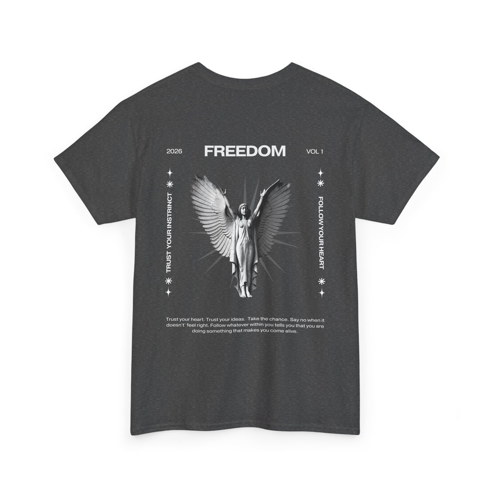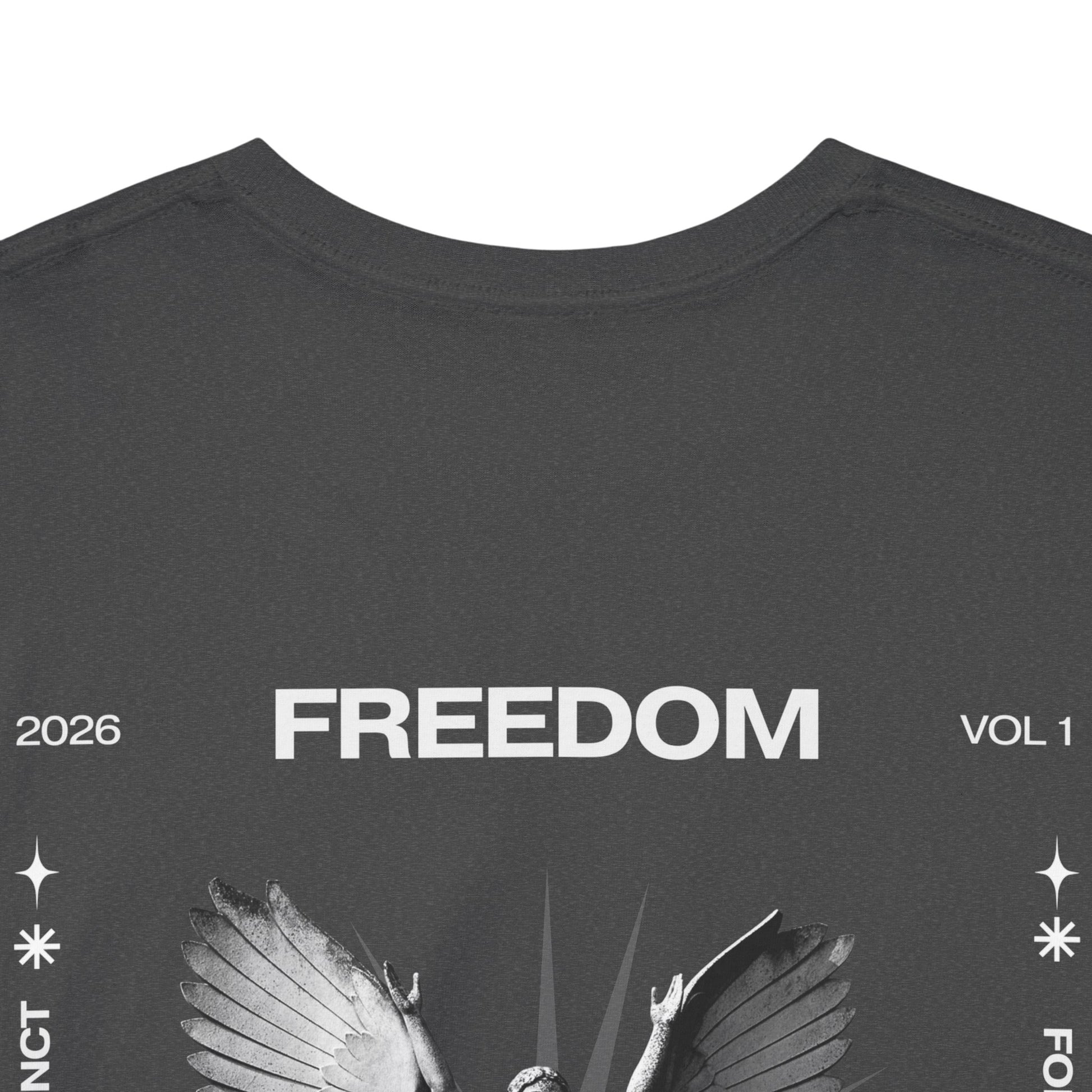 Una camiseta negra atrevida que transmite un mensaje suave y feroz al mismo tiempo. En la parte delantera aparece un ángel en escala de grises con las alas extendidas bajo la palabra «FREEDOM», enmarcado por símbolos sutiles y líneas finas, un diseño que parece un manifiesto de medianoche. El algodón de peso medio es resistente pero transpirable, y mantiene los estampados DTG y DTF nítidos sin desvanecerse. El cuello redondo limpio, el corte clásico holgado y la etiqueta desprendible garantizan la comodidad durante todo el día. Llévala con vaqueros desgastados o debajo de una chaqueta cuando quieras que tu atuendo insinúe algo más profundo: rebelión silenciosa, reflexión y fuerza tranquila.