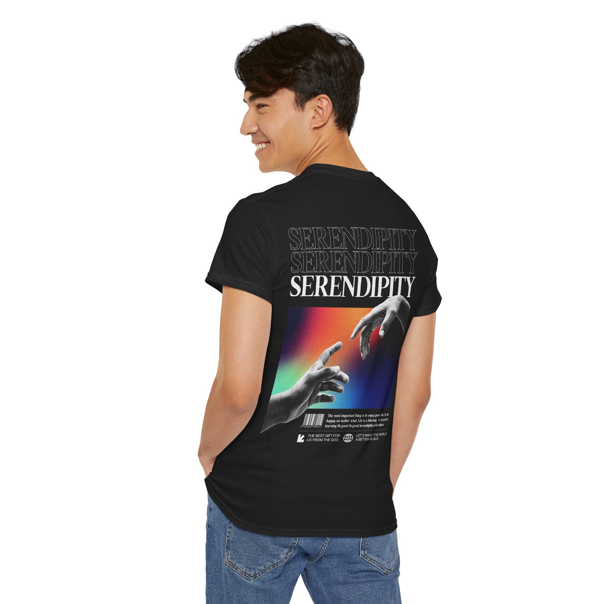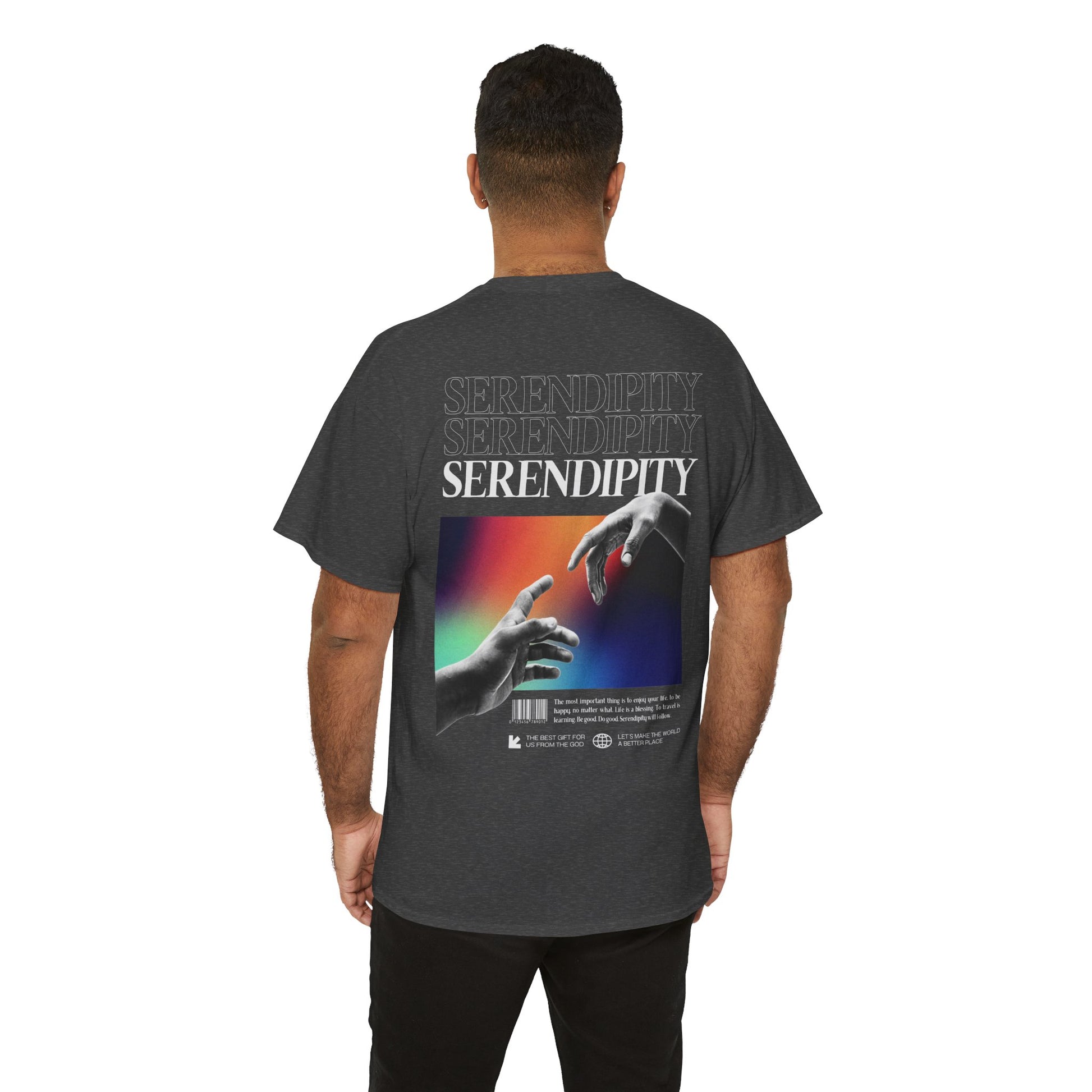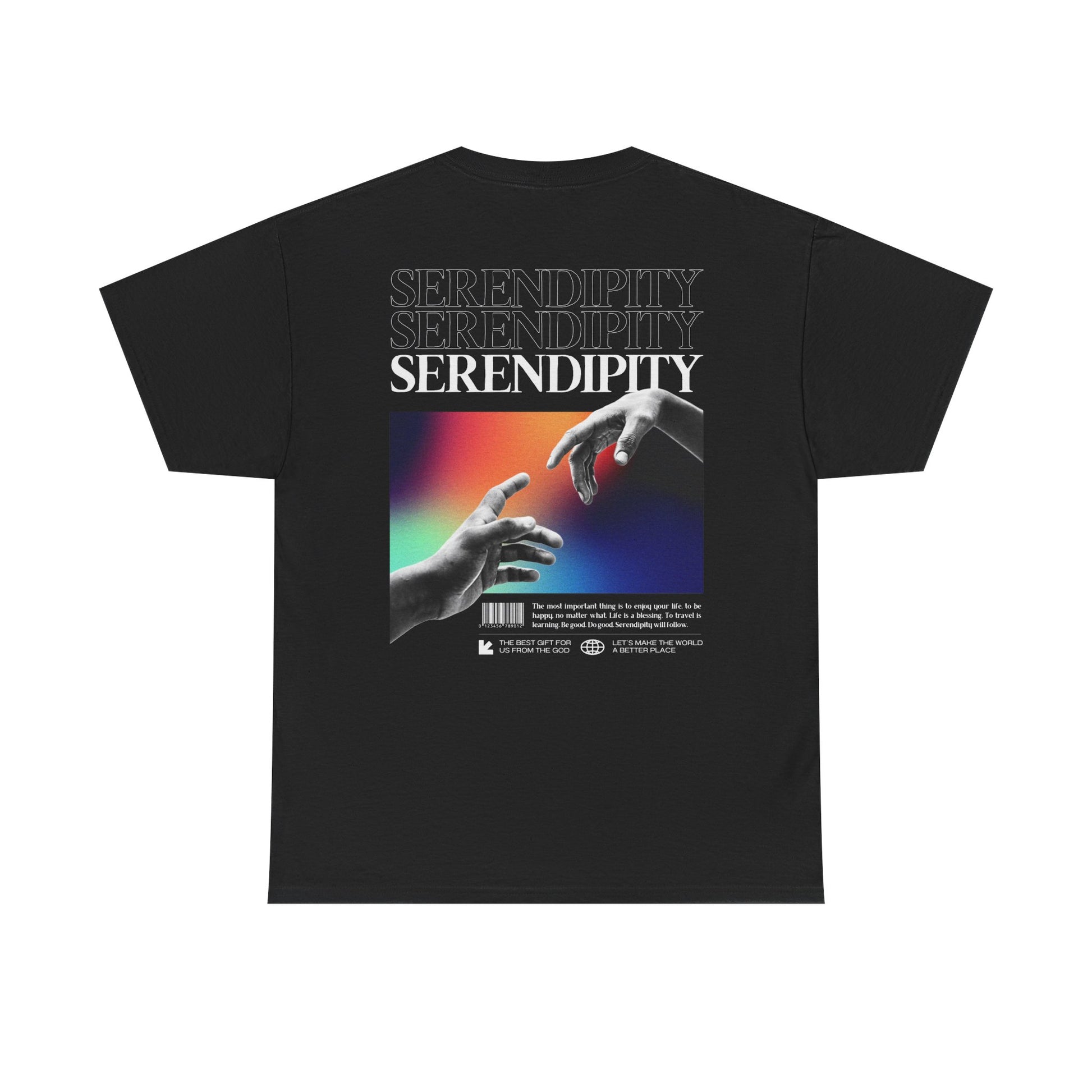 Una camiseta relajada para el día a día que transmite una energía tranquila y cinematográfica. El cuerpo de algodón negro deja que el atrevido diseño de la espalda —dos manos que se alzan contra un suave degradado arcoíris y la palabra «SERENDIPITY»— sea el protagonista. Se lleva como una prenda básica de confianza: holgada en los hombros y el pecho, con cuello redondo acanalado que mantiene su forma y etiqueta desprendible para mayor comodidad sin rozaduras. Esta camiseta es ideal tanto para pasear por la ciudad a última hora de la noche como para pasar la tarde en una cafetería, y añade un toque artístico y reflexivo a los looks con capas o a los conjuntos de vaqueros y zapatillas. Los detalles estampados en las mangas y en el interior del cuello añaden un acabado extra para aquellos que se fijan en los detalles del diseño.