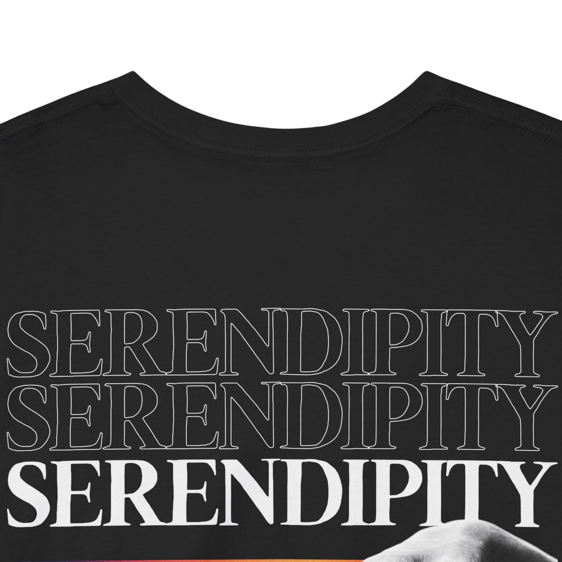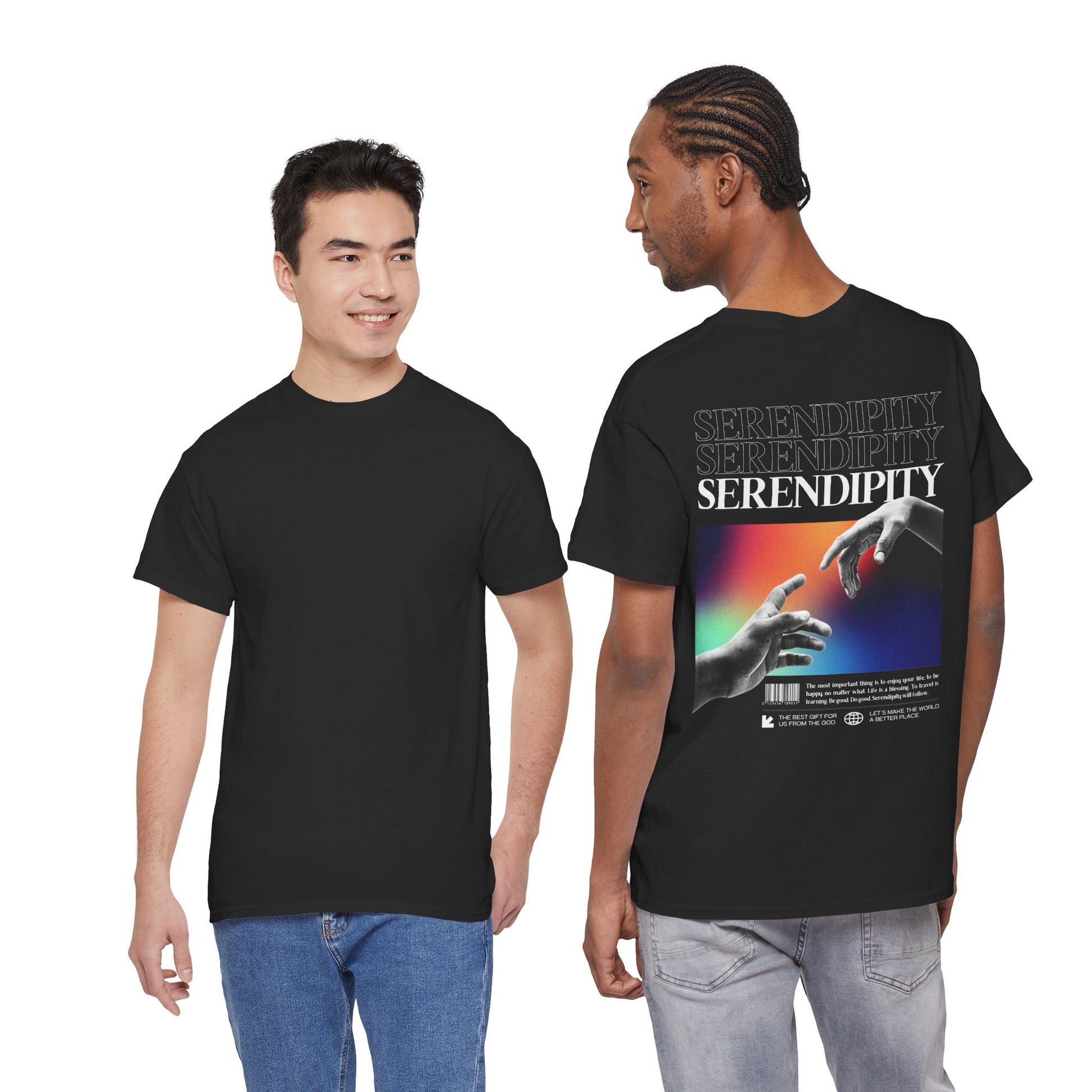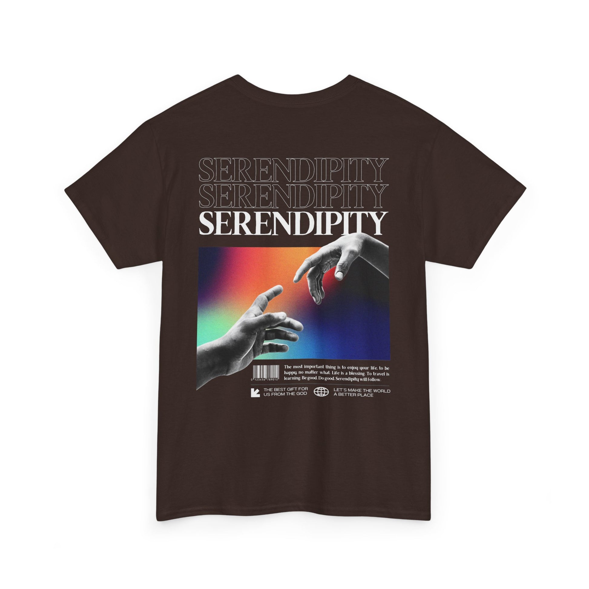 Una camiseta relajada para el día a día que transmite una energía tranquila y cinematográfica. El cuerpo de algodón negro deja que el atrevido diseño de la espalda —dos manos que se alzan contra un suave degradado arcoíris y la palabra «SERENDIPITY»— sea el protagonista. Se lleva como una prenda básica de confianza: holgada en los hombros y el pecho, con cuello redondo acanalado que mantiene su forma y etiqueta desprendible para mayor comodidad sin rozaduras. Esta camiseta es ideal tanto para pasear por la ciudad a última hora de la noche como para pasar la tarde en una cafetería, y añade un toque artístico y reflexivo a los looks con capas o a los conjuntos de vaqueros y zapatillas. Los detalles estampados en las mangas y en el interior del cuello añaden un acabado extra para aquellos que se fijan en los detalles del diseño.