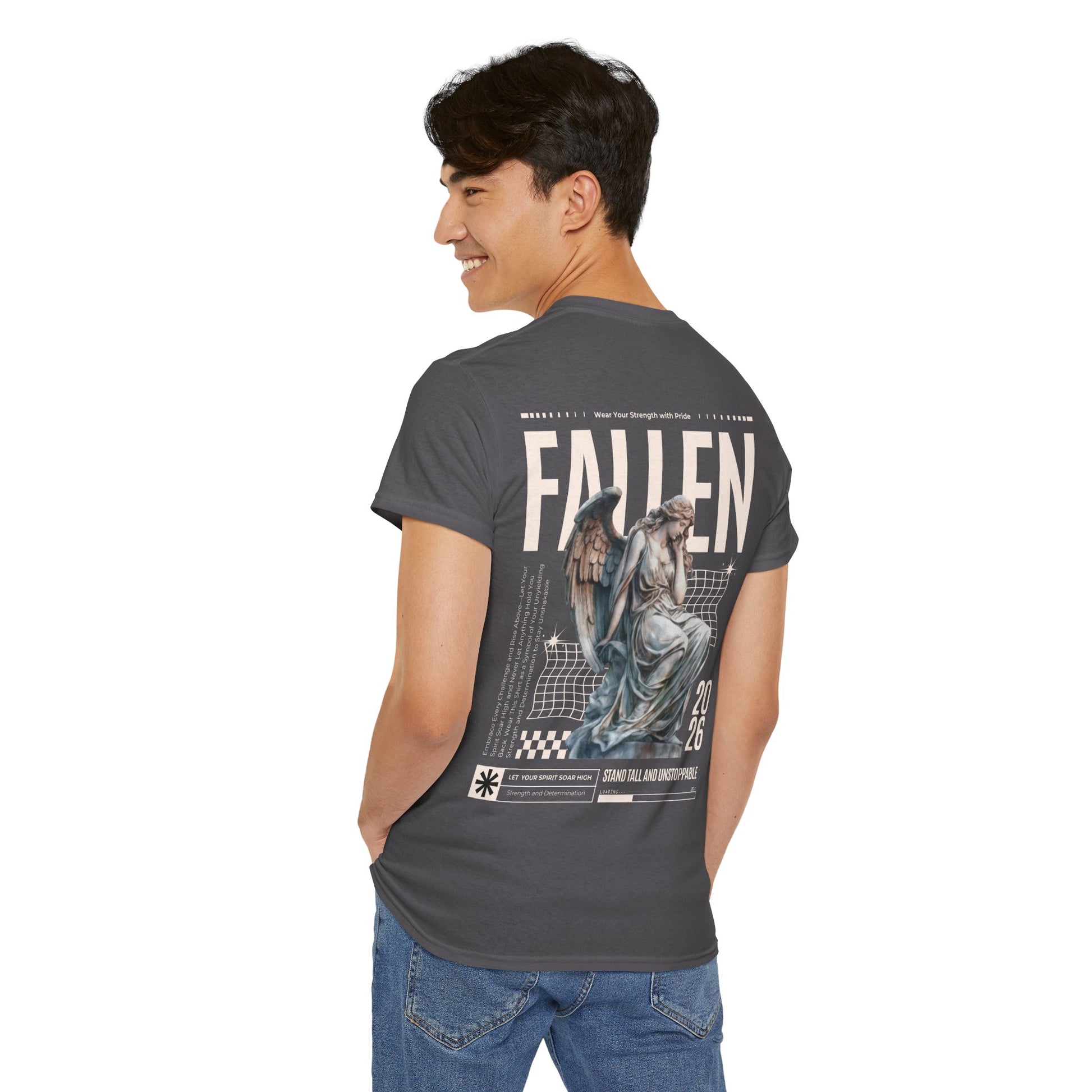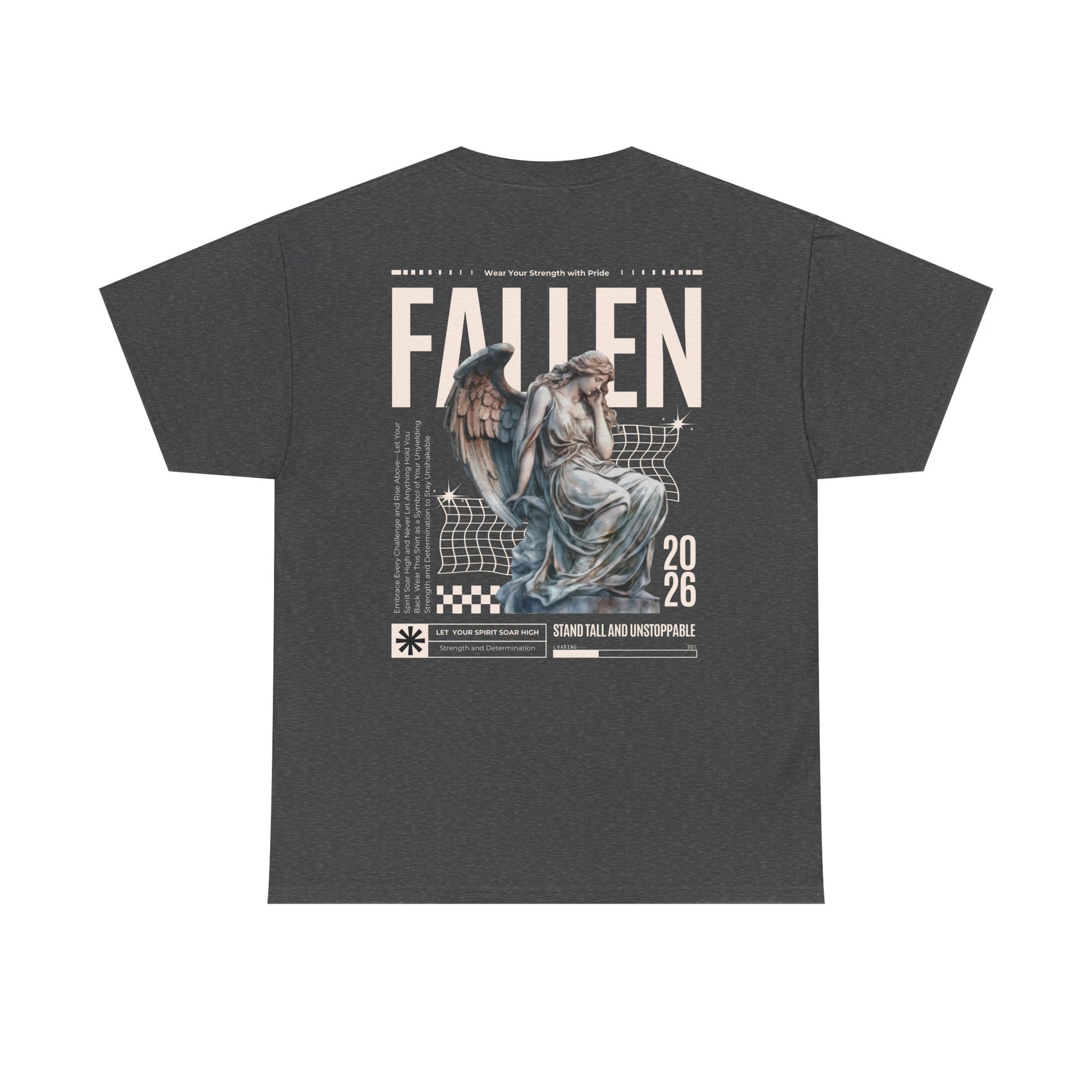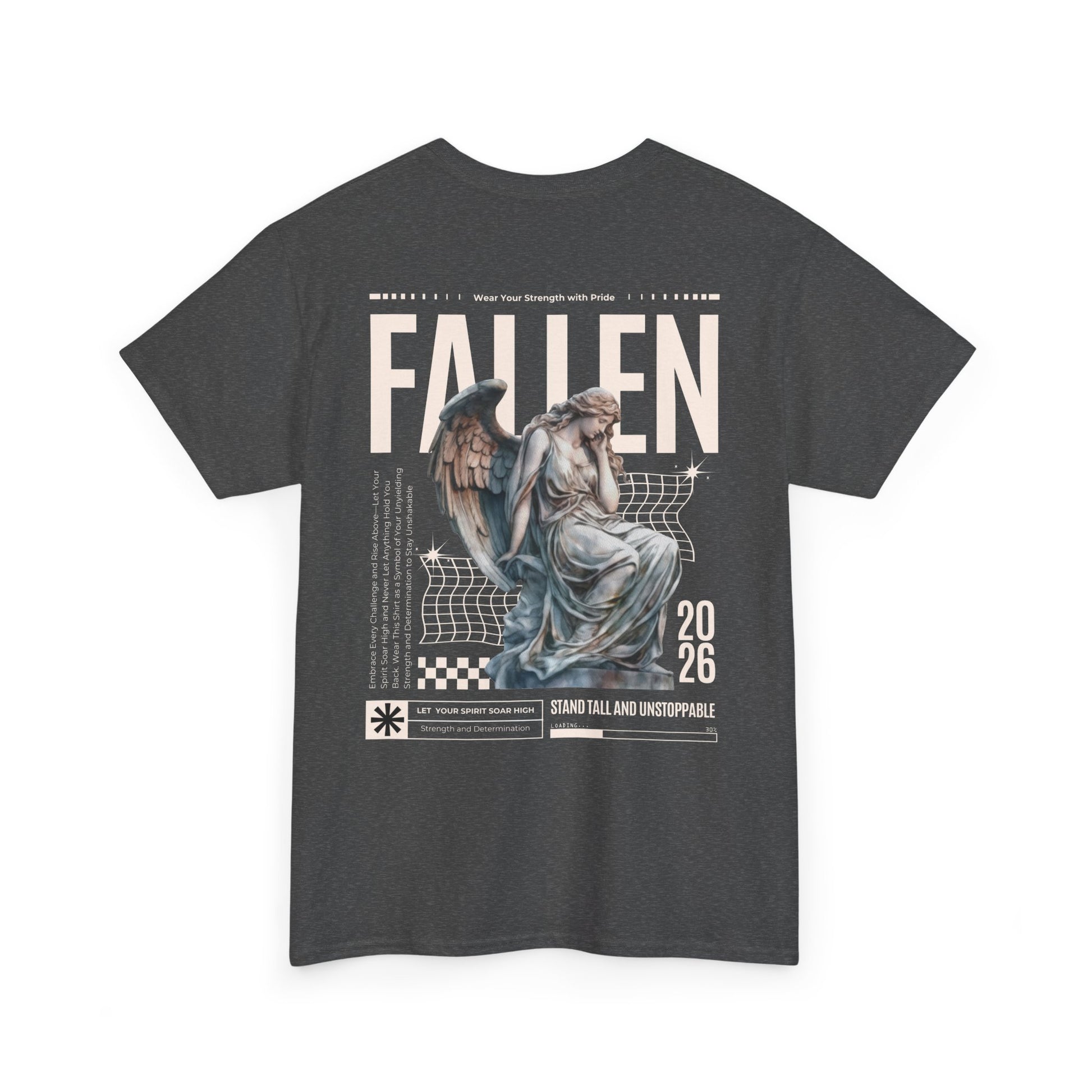 Esta camiseta transmite una energía tranquila y melancólica: suave algodón negro con un corte clásico y holgado, estampada con una gran composición en la espalda que combina una estatua de ángel desgastada, cuadrículas gráficas retro y la palabra «FALLEN» en letras grandes. Es como la banda sonora de los paseos nocturnos por la ciudad y las tiendas de discos polvorientas: desgastada, reflexiva, con un toque dramático. Combínala con chaquetas superpuestas, botas pesadas y tu bufanda favorita; se convertirá en la pieza clave de un conjunto que es a partes iguales nostálgico y moderno. El tejido tiene el peso suficiente para mantener los estampados nítidos, a la vez que es transpirable para poder llevarla durante todo el año. Los pequeños detalles, como la cinta de sarga en los hombros, el cuello acanalado y la etiqueta desprendible, la hacen cómoda y duradera, mientras que la impresión DTF y DTG conservan los finos matices y la textura de la obra de arte. Para cualquiera que se incline por un estilo oscuro y expresivo y quiera un estampado en la espalda que sea como poesía visual, esta camiseta encaja perfectamente en su armario y en su estado de ánimo.