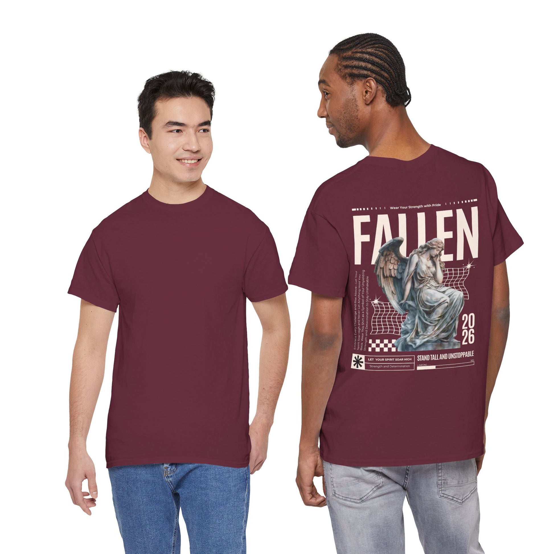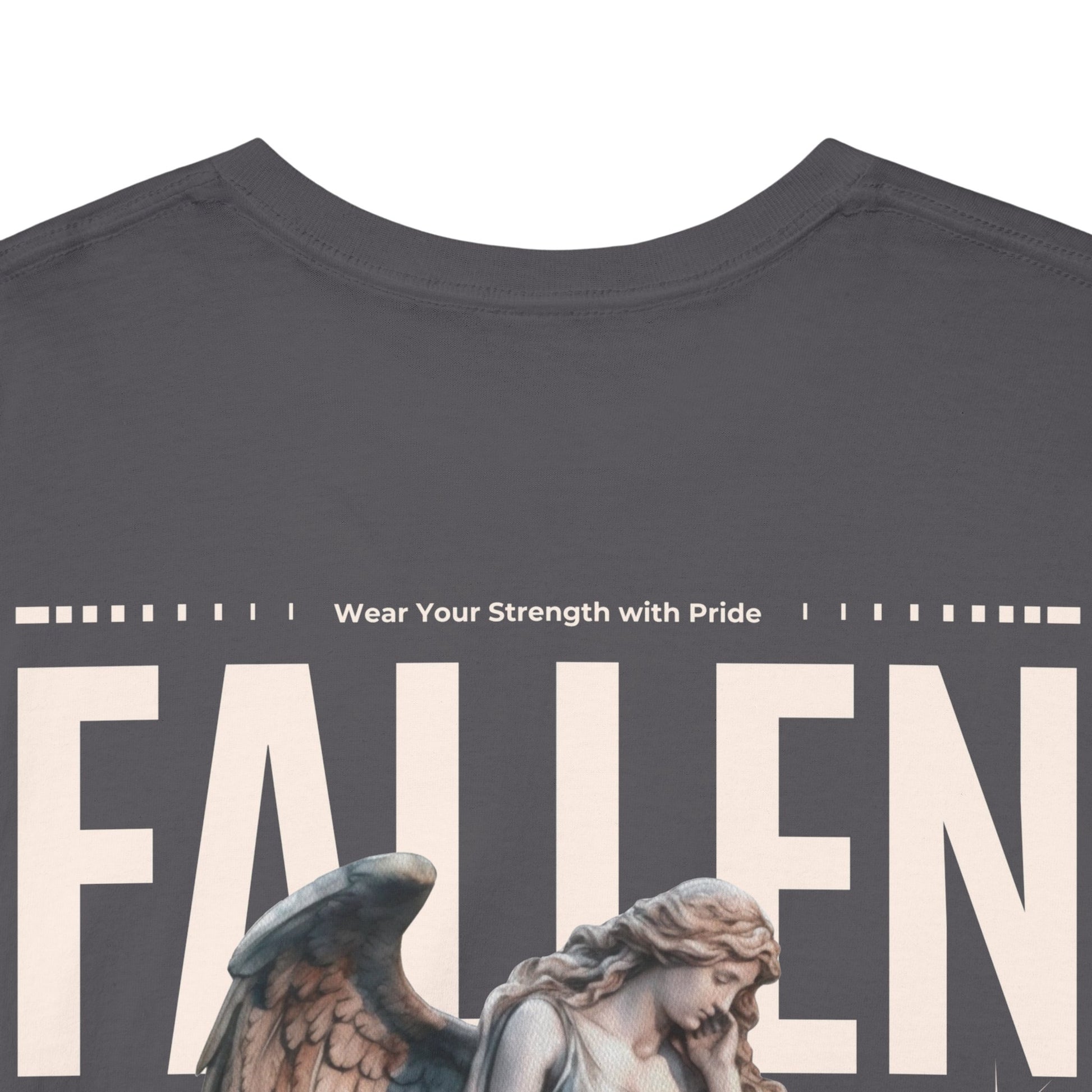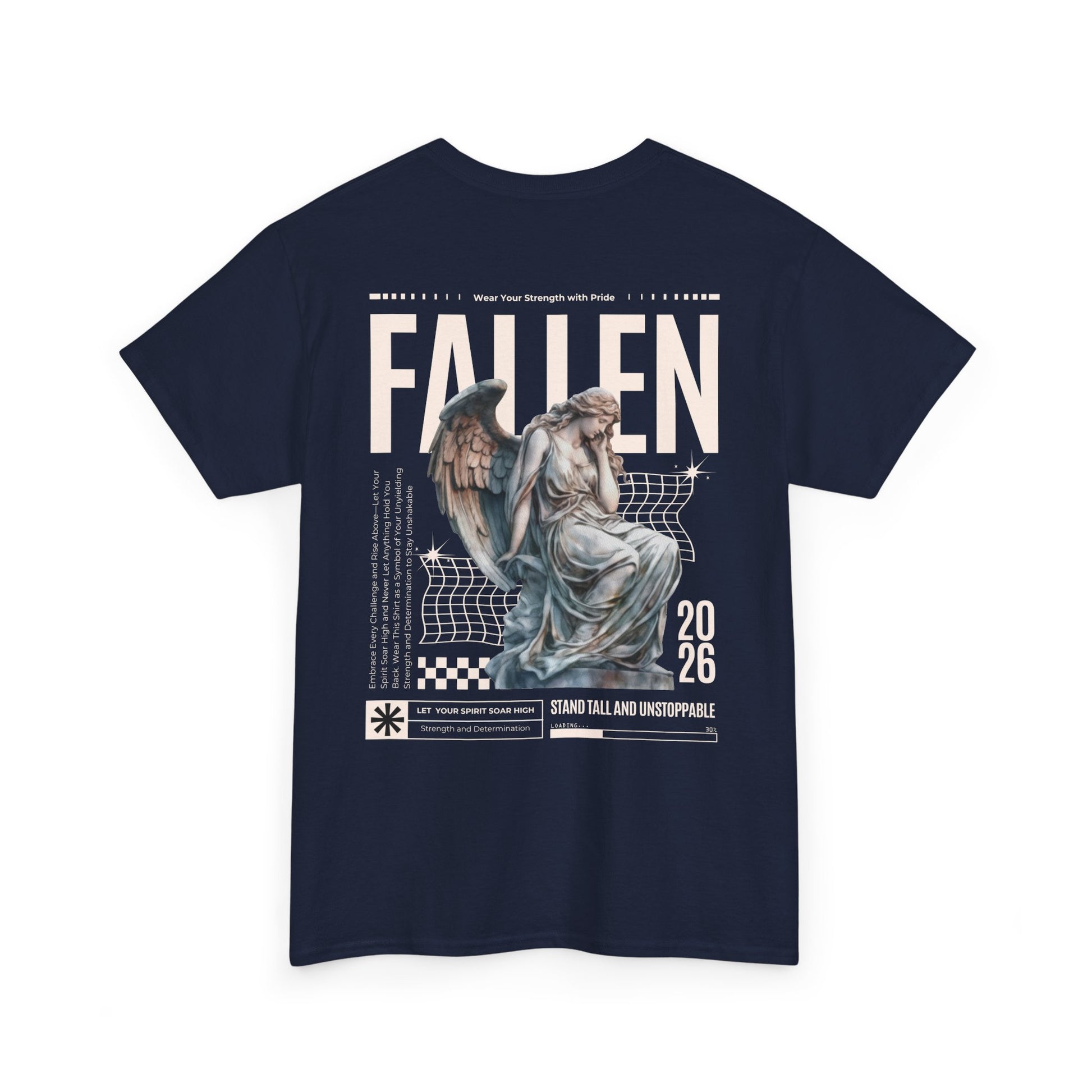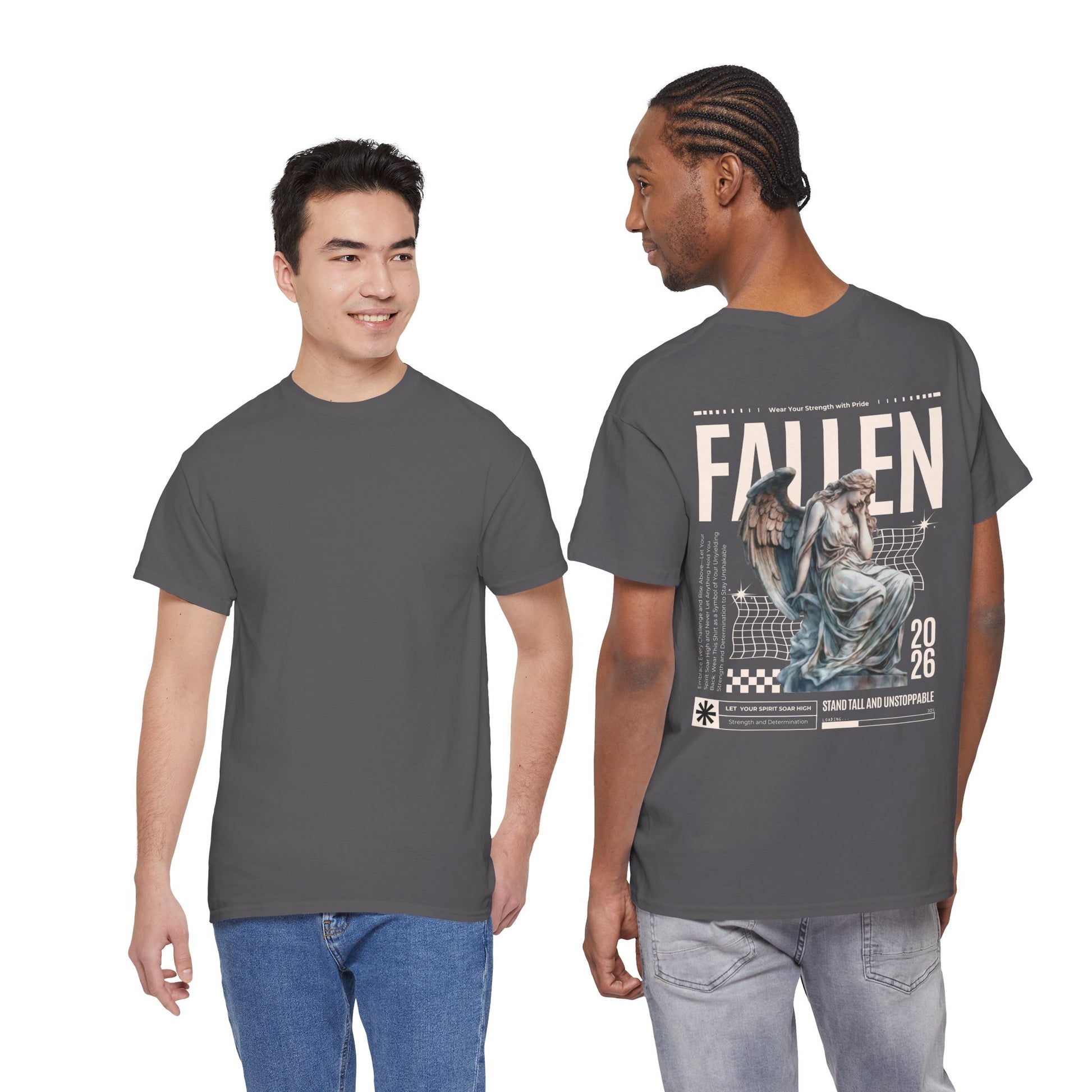 Esta camiseta transmite una energía tranquila y melancólica: suave algodón negro con un corte clásico y holgado, estampada con una gran composición en la espalda que combina una estatua de ángel desgastada, cuadrículas gráficas retro y la palabra «FALLEN» en letras grandes. Es como la banda sonora de los paseos nocturnos por la ciudad y las tiendas de discos polvorientas: desgastada, reflexiva, con un toque dramático. Combínala con chaquetas superpuestas, botas pesadas y tu bufanda favorita; se convertirá en la pieza clave de un conjunto que es a partes iguales nostálgico y moderno. El tejido tiene el peso suficiente para mantener los estampados nítidos, a la vez que es transpirable para poder llevarla durante todo el año. Los pequeños detalles, como la cinta de sarga en los hombros, el cuello acanalado y la etiqueta desprendible, la hacen cómoda y duradera, mientras que la impresión DTF y DTG conservan los finos matices y la textura de la obra de arte. Para cualquiera que se incline por un estilo oscuro y expresivo y quiera un estampado en la espalda que sea como poesía visual, esta camiseta encaja perfectamente en su armario y en su estado de ánimo.